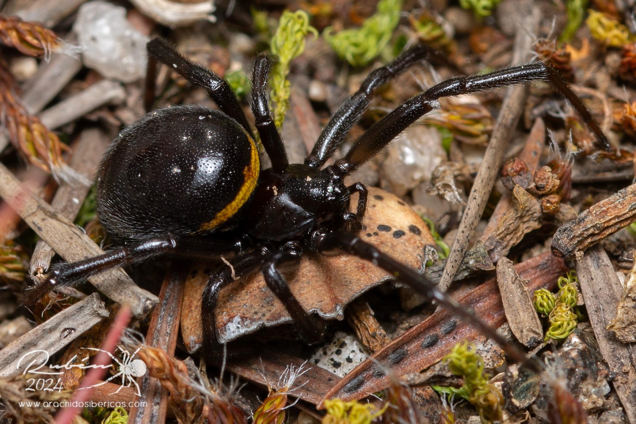 (Walckenaer, 1806)Macho: Por su color y aspecto es confundida muchas veces con Latrodectus, su prosoma es muy oscuro o negro. El opistosoma es redondeado, negro con una banda frontal blanquecina, igual que la banda dorsal longitudinal que tiene apariencia de tres cruces continuadas que recuerdan a la raspa de un pez. Las patas tienen un color marrón amarillento, con la coxa, trocánter y rótula visiblemente oscurecidos. Longitud corporal: 4,5 - 8,4 mm.