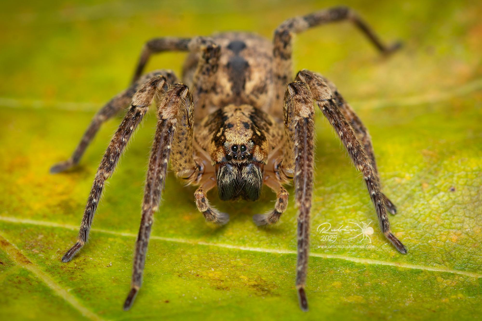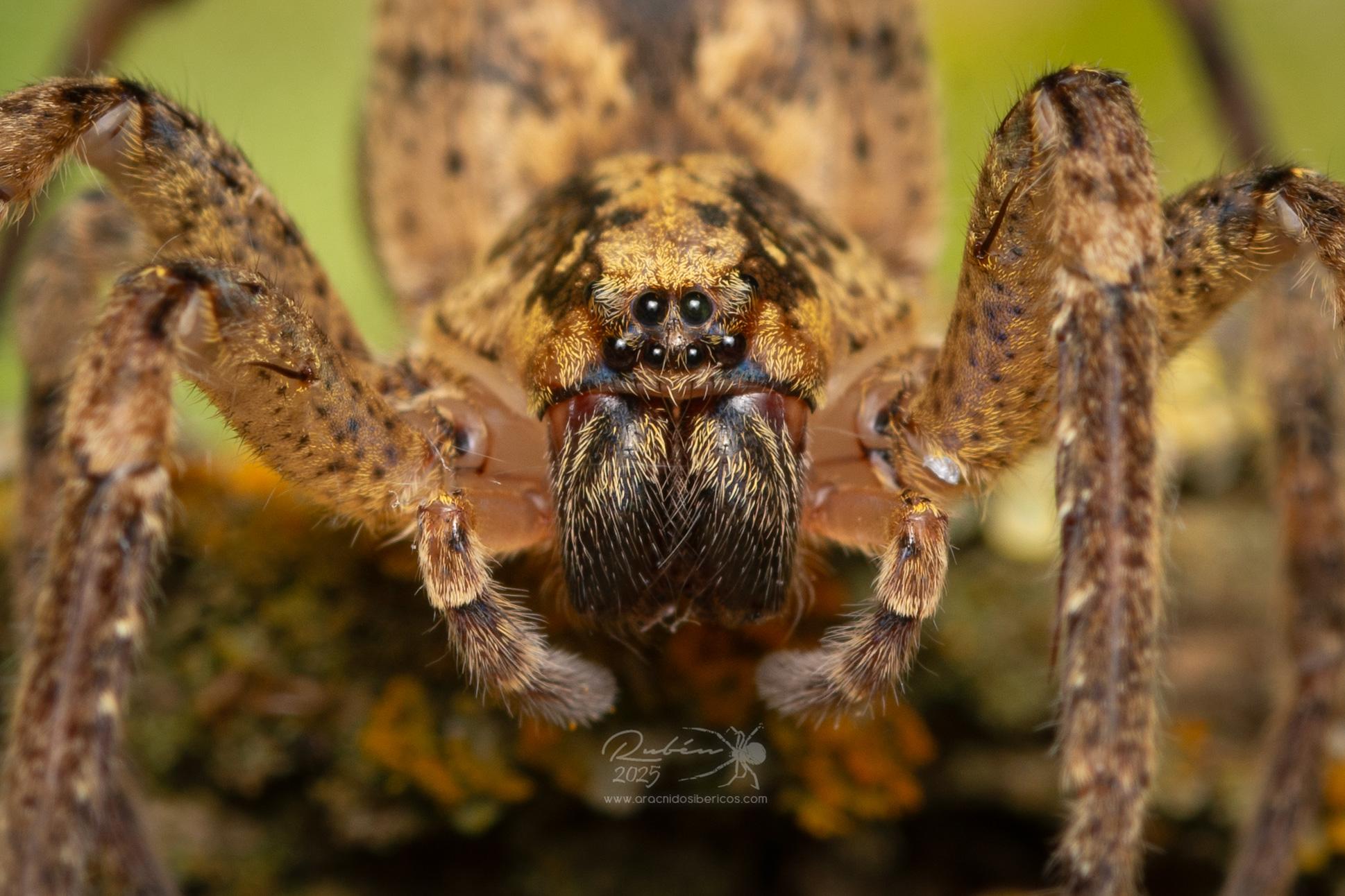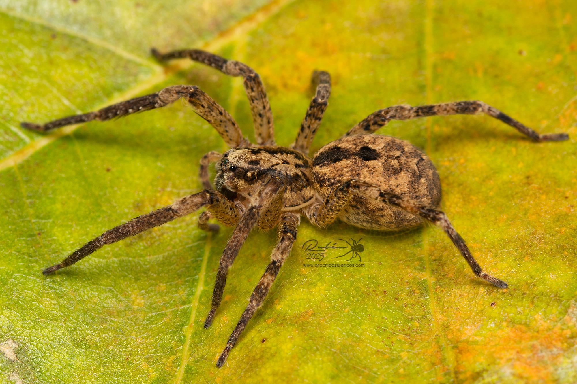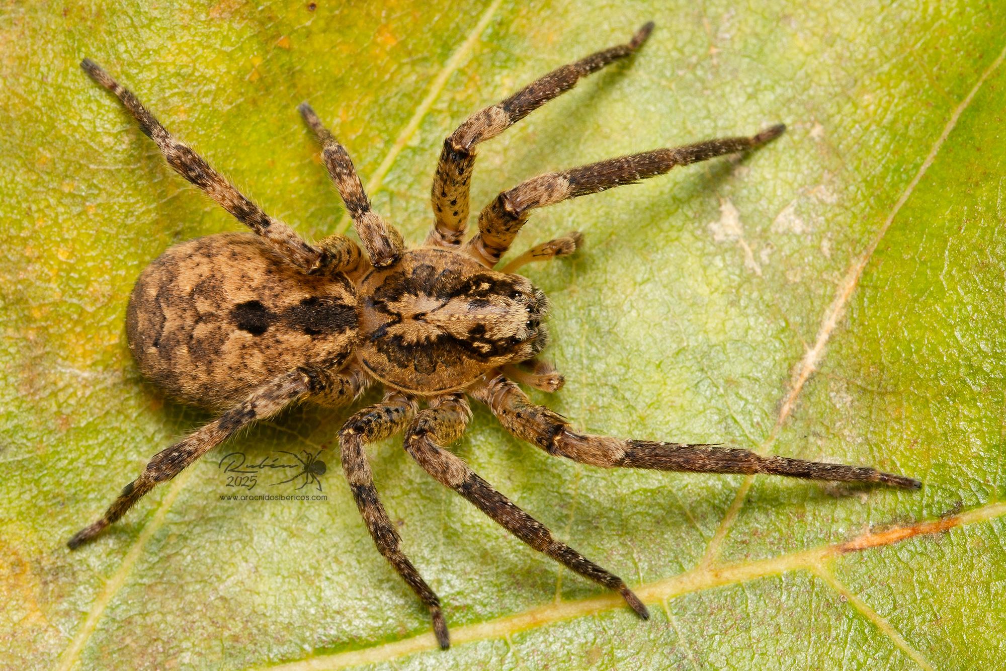 (Dufour, 1820)Descripción: Prosoma entre pardo y amarillo- blanquecino,con dos bandas longitudinales oscuras, en la banda central de color claro se marca una X característica de color oscuro. Opistosoma pardo-amarillento con filas de puntos oscuros y manchas negras centrales. Patas robustas, anilladas en negro y gris, los tarsos, metatarsos y a veces hasta la tibia están mas oscurecidos. Longitud macho: 10 - 13 mm. Longitud hembra: 10 - 19 mm.