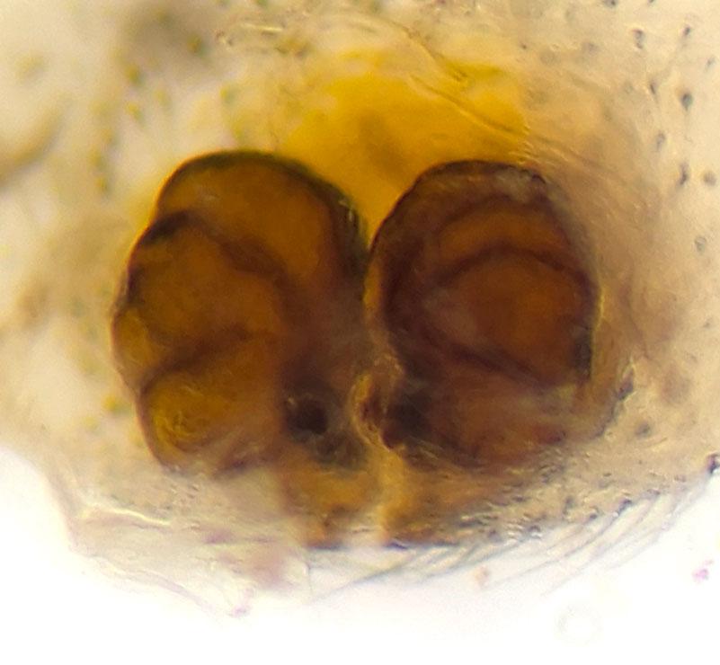 Hembra: Su color no es tan oscuro como el del macho. El prosoma es marrón-ocre. El opistosoma es marrón oscuro en la parte dorsal, y presenta los laterales, una banda central y unas rayas transversales de color más claro. Longitud corporal: 6 - 10 mm.