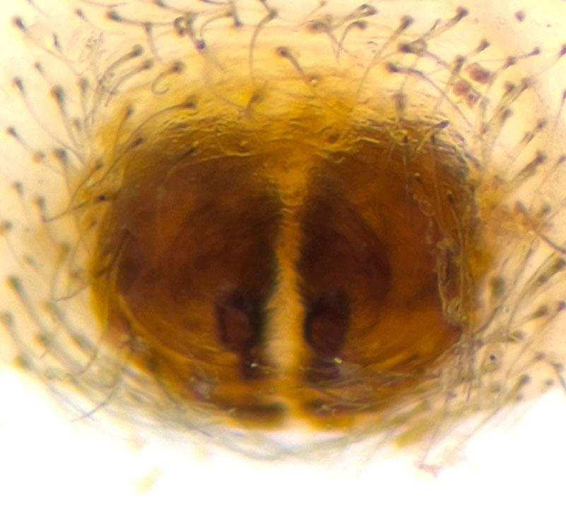 Thorell, 1872Macho: Prosoma marrón oscuro casi negro, con un patrón fino y más claro en forma de V. Región de los ojos también más clara. El esternón es marrón claro o amarillento oscuro. Palpos y quelíceros de color marrón oscuro con pequeñas espinas. Las patas son de color marrón oscuro casi negro como el prosoma, con algunas manchas claras, sobre todo en los extremos. Opistosoma entre marrón y gris, con franjas transversales claras. Longitud corporal: 4 - 6 mm.