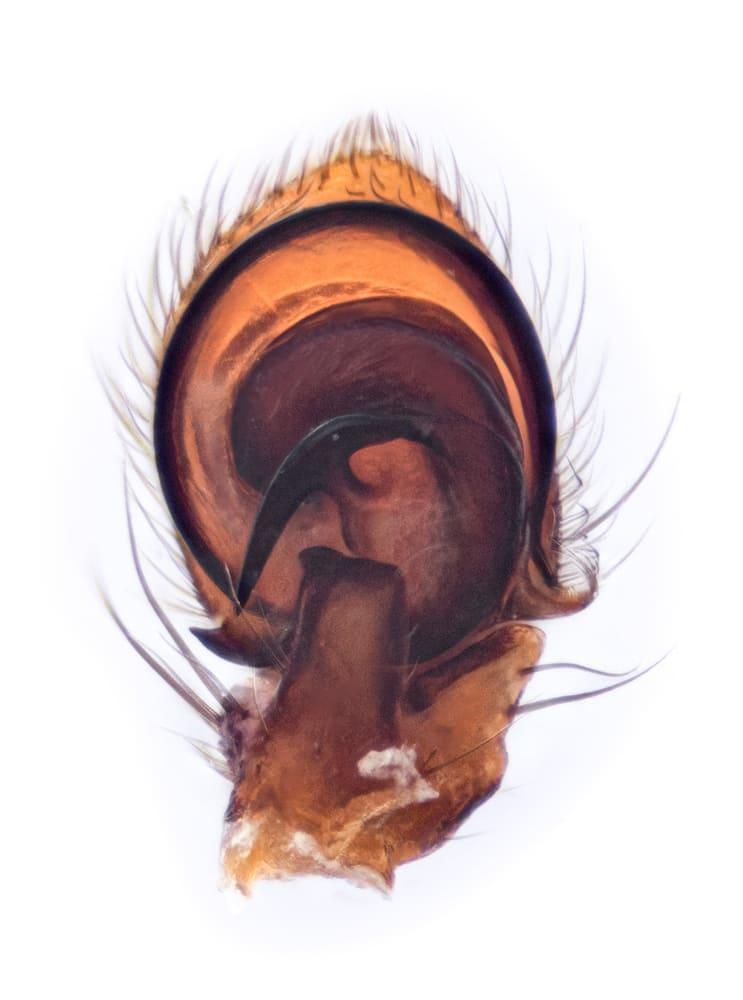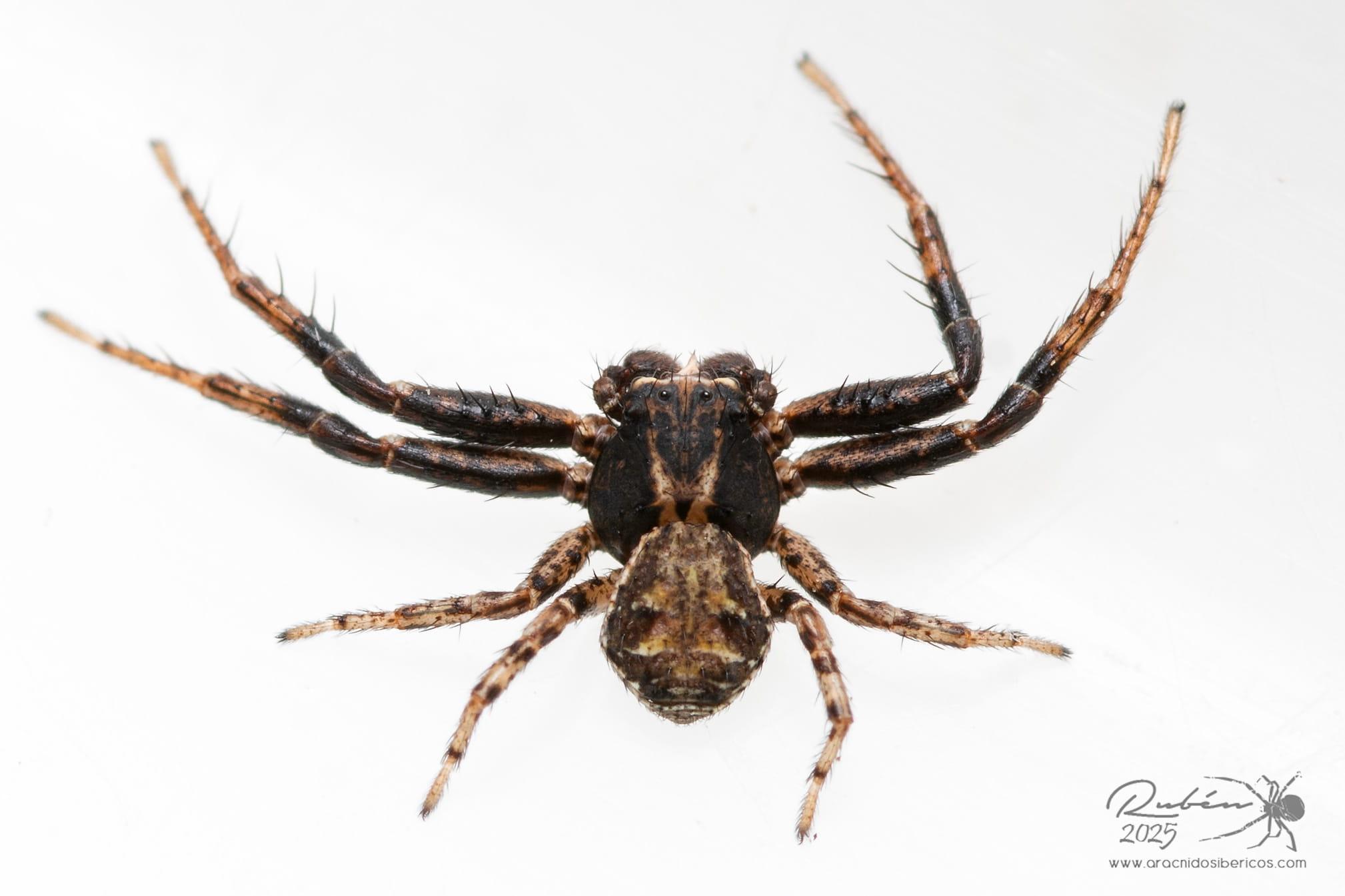 Simon, 1875Descripción: prosoma marrón oscuro, casi negro, ligeramente manchado de marrón anaranjado en los bordes, arriba con una banda ancha de color marrón, un poco más claro, a menudo rojiza, no muy distinta al frente, pero limitada detrás por dos líneas de un blanco opaco o amarillento, que se unen en un ángulo muy agudo, tegumento finamente puntuado, pelos muy largos, formando tres líneas longitudinales arriba y adornando los lados de la cara; tubérculos oculares laterales bien pronunciados. Abdomen marrón oscuro o negro, con un borde blanco y una banda longitudinal muy ancha de color blanco o marrón anaranjado, presentando en la segunda mitad tres pares de grandes denticulaciones horizontales, pelos bastante cortos, casi iguales. Patas con fémures, rótulas y base de las tibias casi negros en los dos primeros pares, marrón rojizo en los dos pares posteriores, todas las demás partes de un amarillo más o menos brillante, a veces puntuado de marrón; en el fémur del primer par una hilera irregular de cuatro o cinco espinas desiguales, la segunda y la cuarta muy largas, formula 1-2-4-3. Longitud macho: 2,46 - 3,9 mm. Longitud hembra: 4,38 - 6,13 mm.