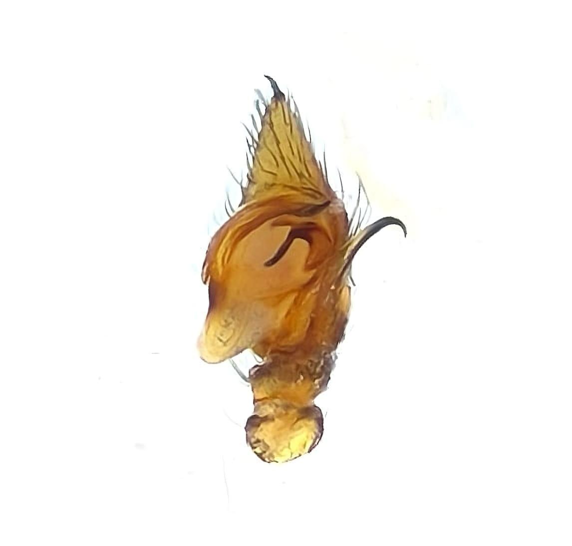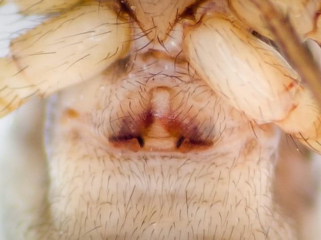 Hembra: Epigino: placa epiginal acampanada, más o menos redondeada anteriormente, con bordes paralelos, divergente posteriormente, acompañada de un par de alas trapezoidales; las aberturas y fosas copulatorias no son visibles, pero podrían estar ubicadas cerca de las alas; la vulva está compuesta por conductos de las espermatecas intrincados, las espermatecas son visibles a través del tegumento; ápices de las espermatecas convergentes, ligeramente dobladas hacia abajo y tocándose entre sí. Longitud corporal: 3,2 - 4,2 mm.