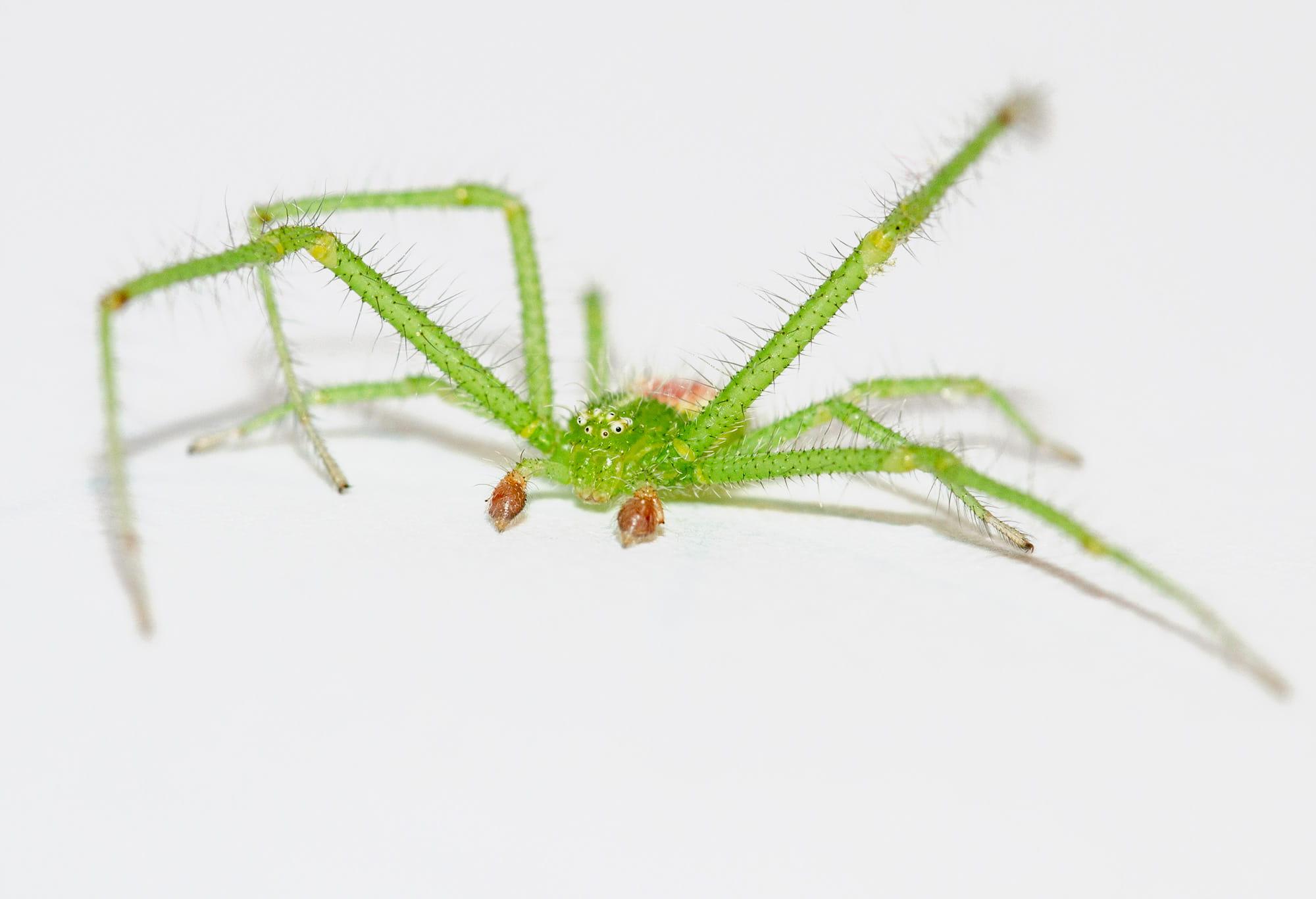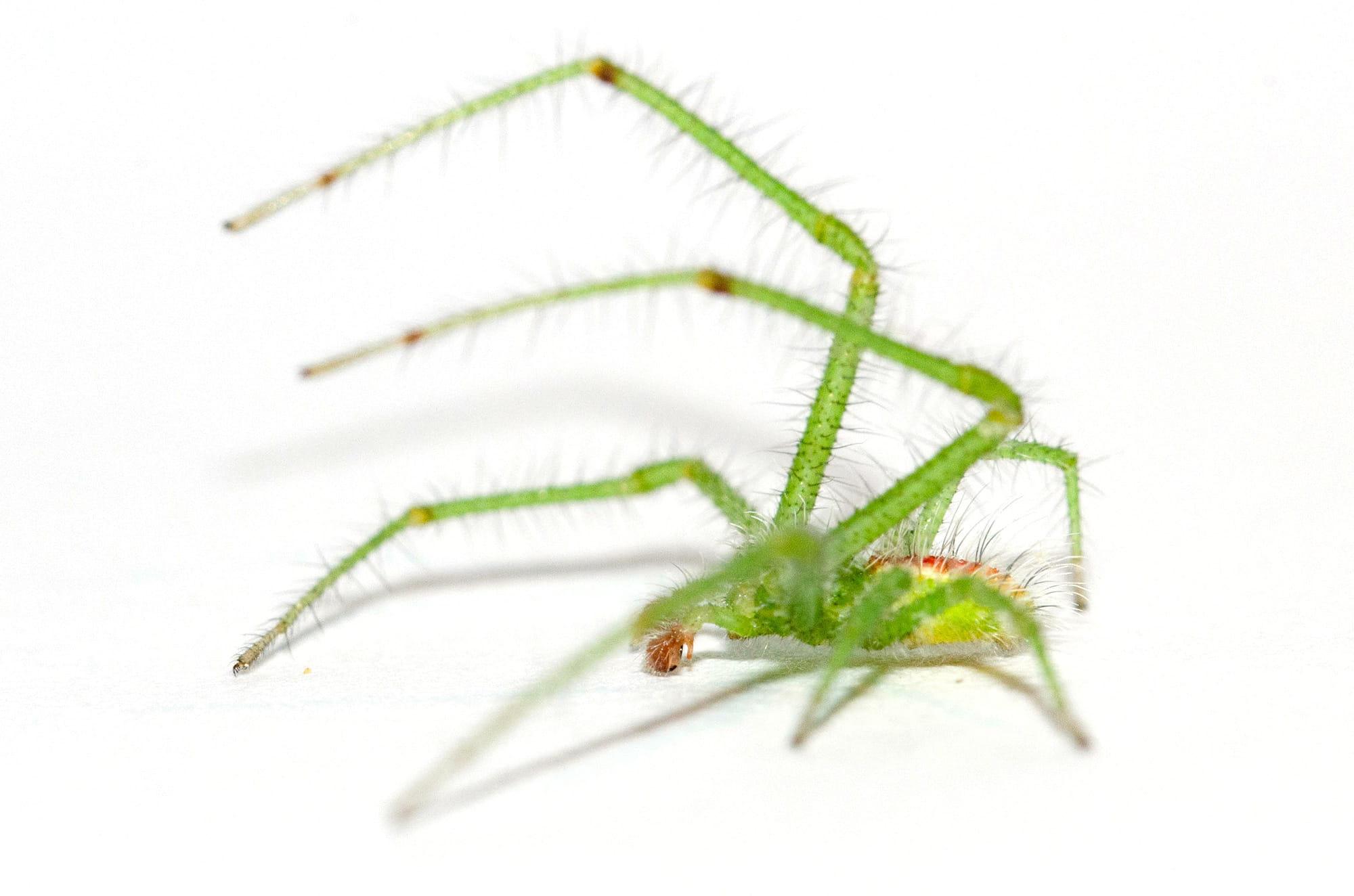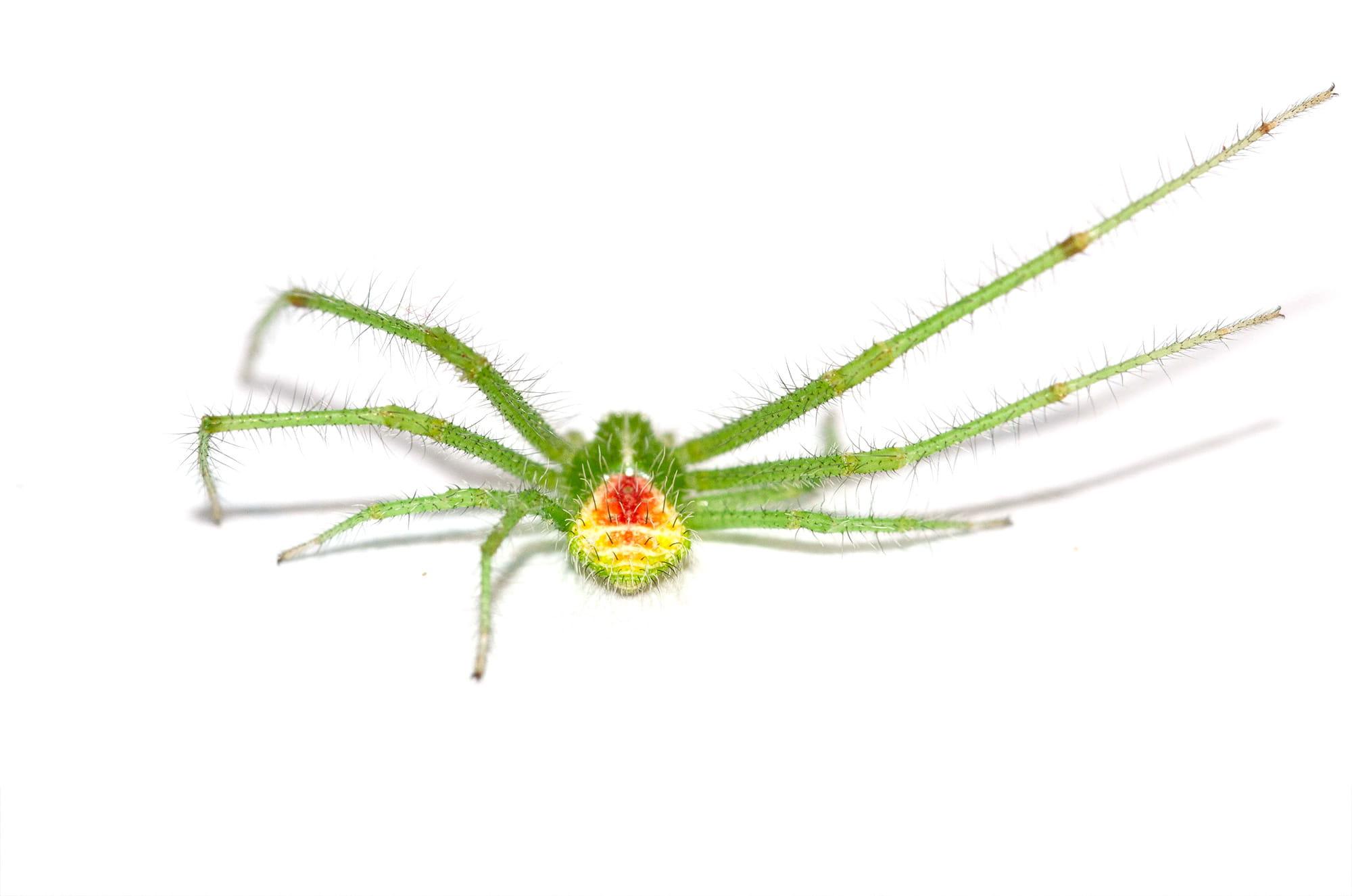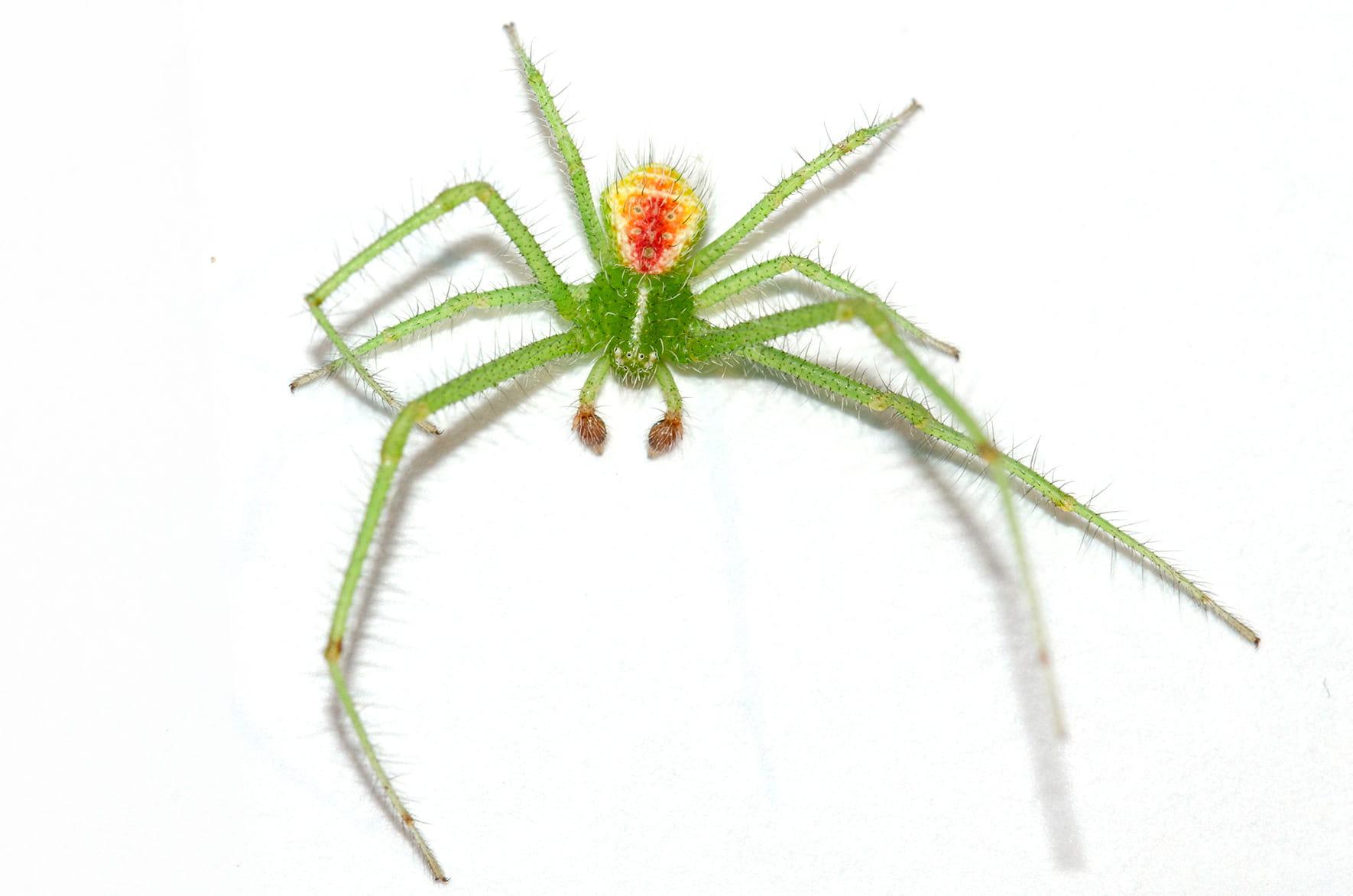 (Latreille, 1819)Macho: Prosoma verde claro, redondeado a los lados y estrechado al frente, con pelos largos de color blanco o grisáceo, ojos pequeños y situados en pequeños tubérculos claros. Opistosoma más delgado que en la hembra, ensanchado en su tercio posterior, amarillo o verde pálido, generalmente con una marca cardiaca rojiza y cubierto con largos pelos o espinas. Patas largas, de color verde pálido, cubiertas de numerosas espinas, los pares I y II generalmente con anillos oscuros en la zona apical de tibia y metatarso. Longitud corporal: 3,5 - 5,5 mm.