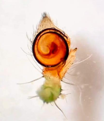 Hembra: Similar al macho pero con el abdomen más ancho, casi triangular, estrecho al frente y ensanchado posteriormente, verde pálido, generalmente con un patrón claro de líneas que dibujan el triángulo, una línea central y dos pares de puntos a cada lado, cubierto de pelos erizados blanquecinos. Patas y prosoma de color verde pálido. Epigino bastante pálido, pero con una lengua casi circular. Longitud corporal: 8 - 11 mm.
