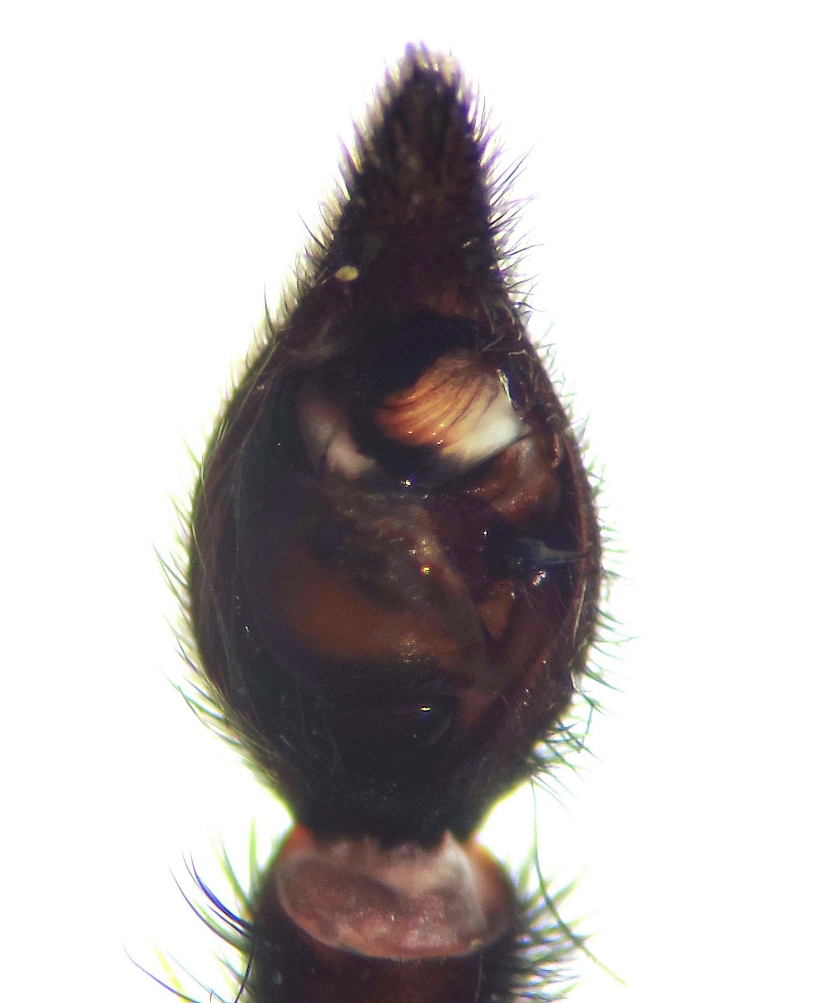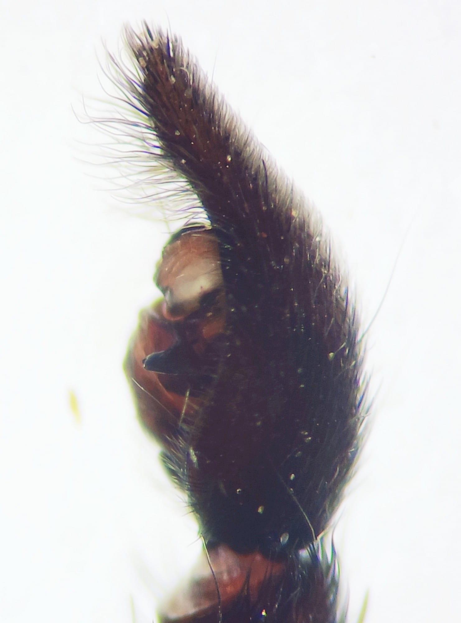 (Clerck, 1757)Macho: Prosoma marrón amarillento claro, con banda lateral marrón. Quelíceros marrones, más claros en la base. Esternón marrón con una mancha clara en la parte media. Patas I marrones oscuras predominantemente (solo los machos), las demás marrones con los fémures marrón amarillentos con algunas manchas marrones. Dorso del abdomen marrón oscuro con una banda media marrón claro. Marca lanceolada anteriormente algo más oscura. Vientre gris amarillento. Pedipalpo: tibia palpal con una espina, cymbium con 3 espinas en el ápice, tegulum que cubre el lado prolateral del bulbo; extremo retrolateral de la apófisis tegular triangular, medialmente con borde afilado, apófisis terminal con punta ancha y mitad distal del émbolo sin lámina semitransparente. Longitud corporal: 8 - 11 mm.