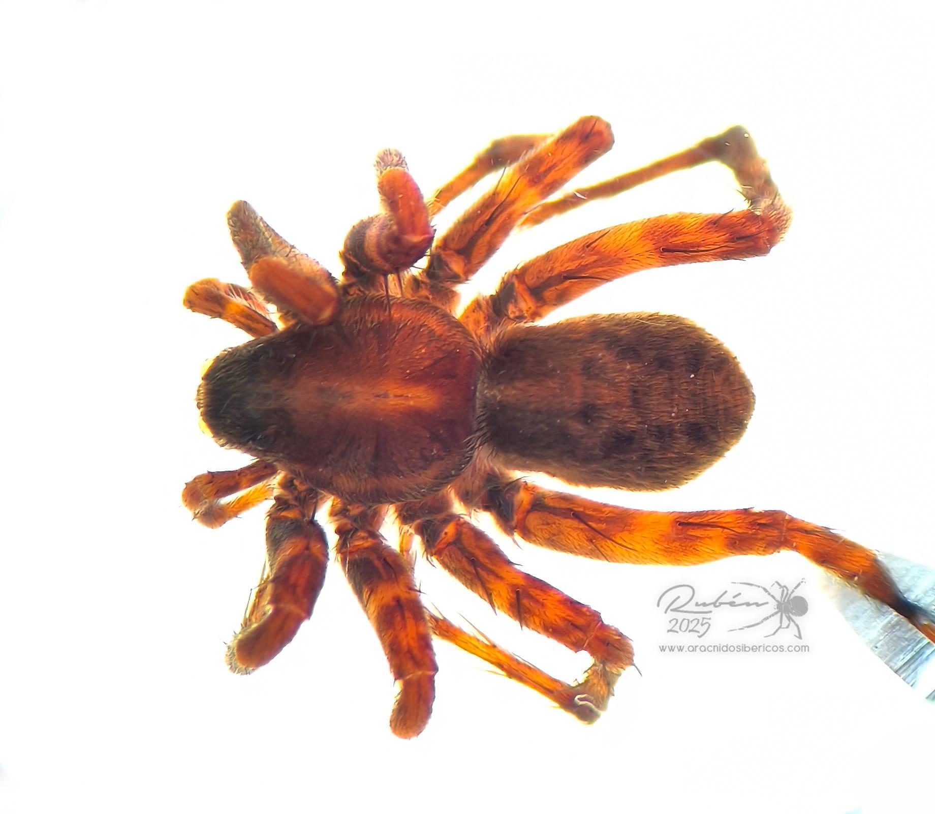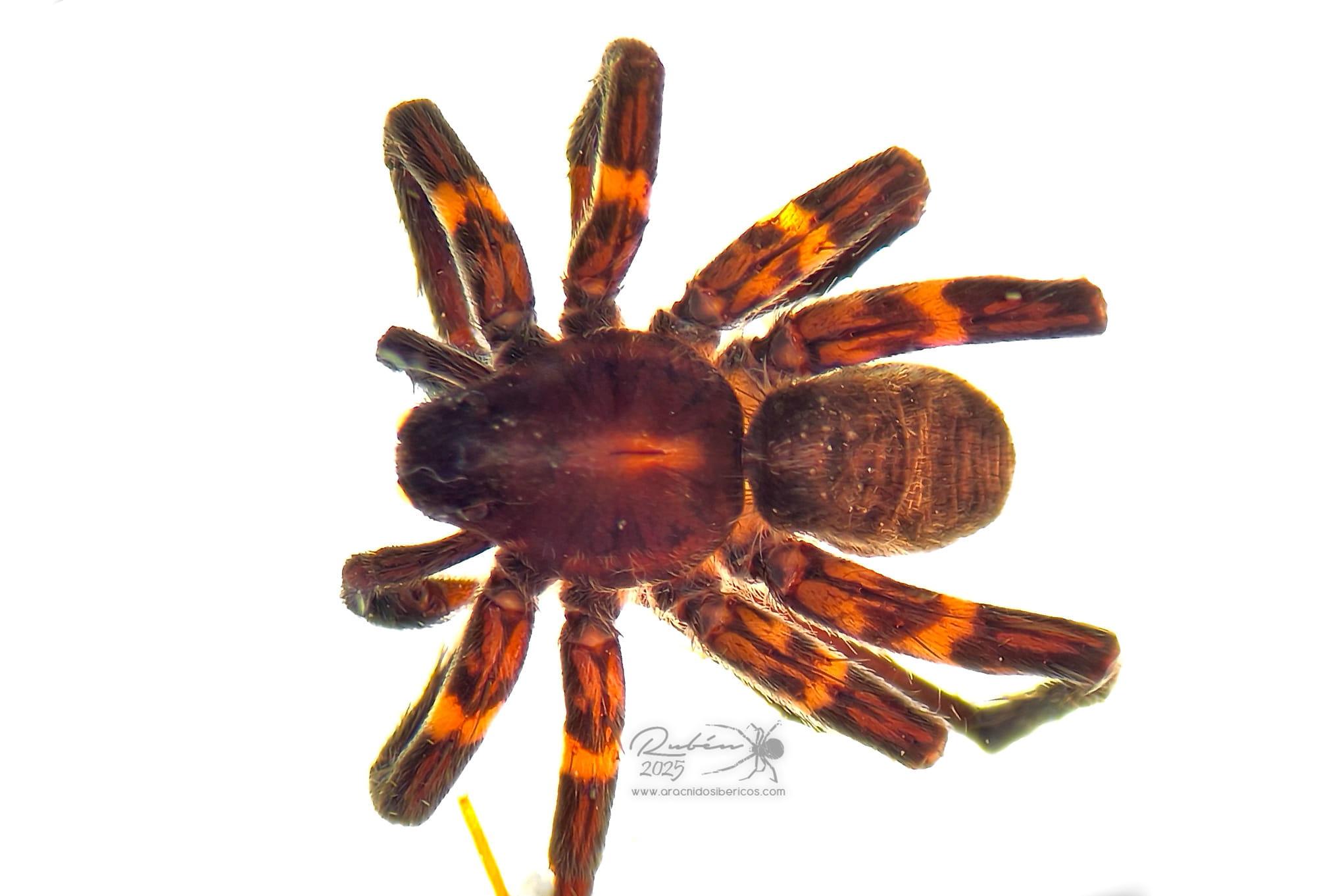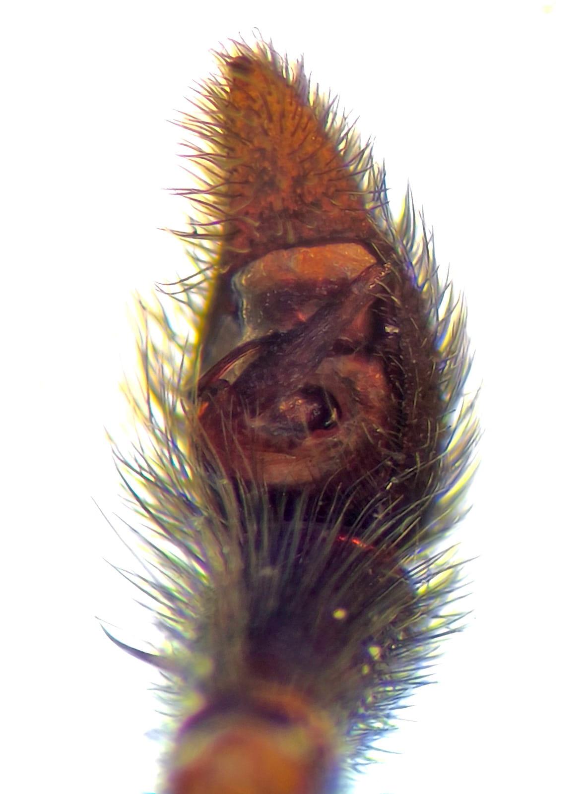 Simon, 1876Macho: Prosoma marrón amarillento oscuro con bandas claras mal definidas, banda media ensanchada detrás del área ocular, bandas claras laterales indistintamente rotas en 3 - 4 puntos; la pubescencia del caparazón es más larga y densa que en otras especies del grupo, frente con pelos negros únicamente, bandas laterales claras y bandas marginales oscuras con pubescencia blanca mezclada con pelos negros. Quelíceros amarillentos con pelos largos blancos y negros en la parte delantera. Esternón marrón con una mancha clara estrecha en la parte anterior. Abdomen dorsalmente marrón, teñido de negro y con una mancha lanceolada clara estrechamente bordeada con negro. Vientre con pubescencia blanca y pelos negros cortos dispersos. Patas de color marrón amarillento con fémures anillados dorsalmente de forma indistinta, patas I y II con pubescencia más larga y densa que las III y IV; con fórmula 4,1,2,3. Palpo marrón con pubescencia negra solamente, tégulum con un proceso retrolateral esclerotizado corto y ancho, puntiagudo, apófisis tegular principal truncada en la punta, extremo apical ligeramente curvado hacia afuera. Longitud corporal: 6,6 mm.