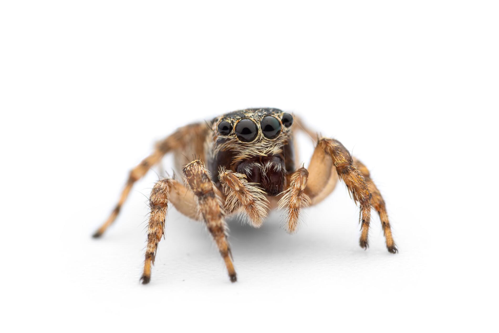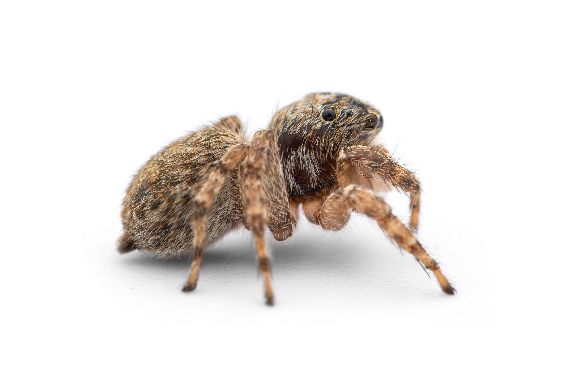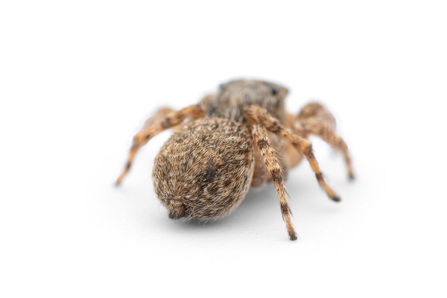 Dalmas, 1920Macho: Prosoma bastante elevado, corto e inclinado, con pelos blancos y rojos mezclados alrededor de los ojos anteriores, y la extensión de la mancha torácica blanca en dos bandas paralelas hasta los ojos medios anteriores, pestañas blancas con algunos pequeños pinceles aislados de pelos rojos, mejillas y barba rojas. Abdomen corto, cubierto de pubescencia semejante a la del prosoma, en la primera mitad una franja central oscura con grandes manchas blancas a los lados , en la segunda mitad otra mancha blanca grande trilobulada, que llega hasta las hileras. Patas marrones con anillos oscuros, con fórmula 3,4,1,2. Longitud corporal: 4,4 - 4,8 mm.