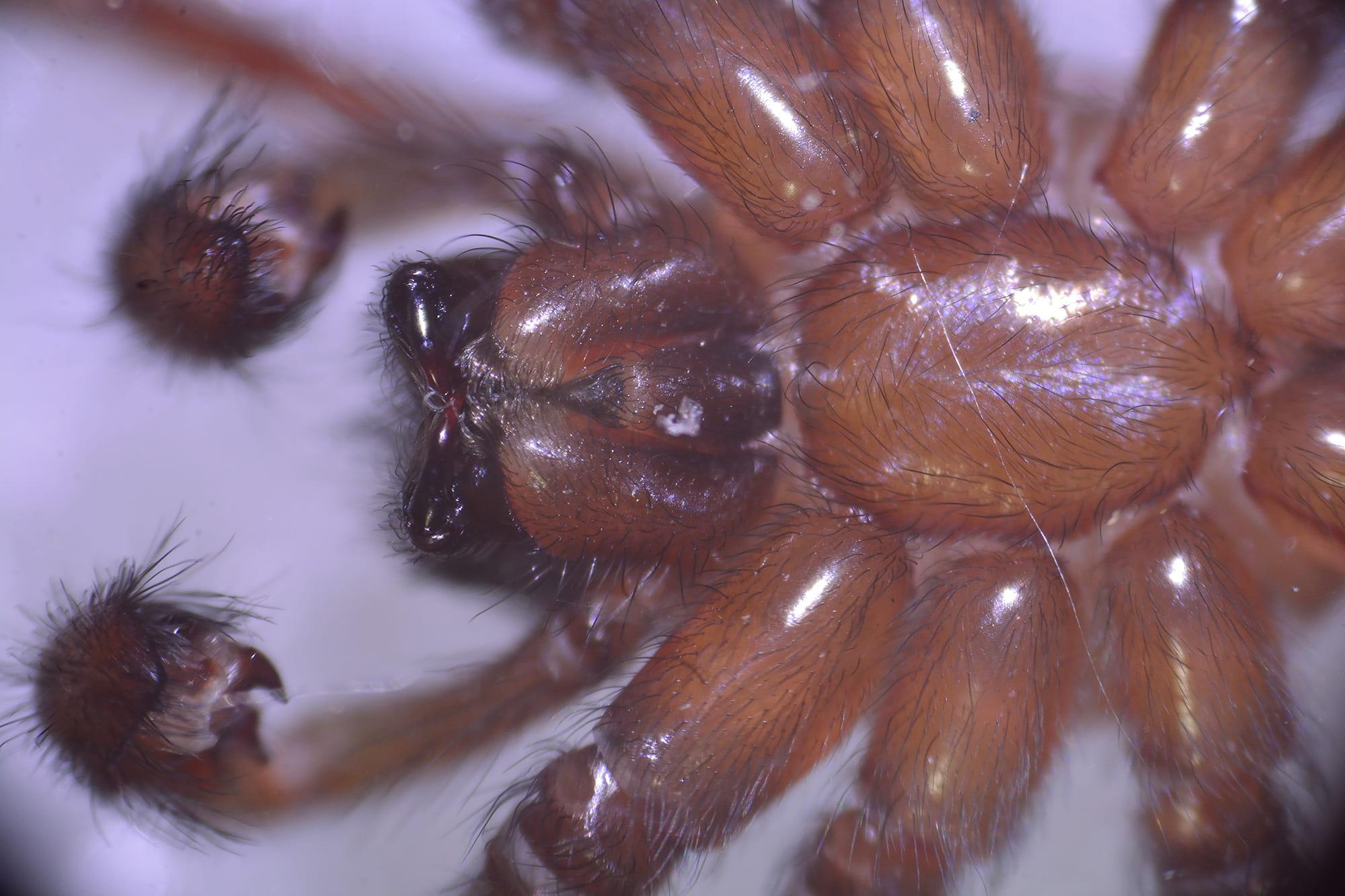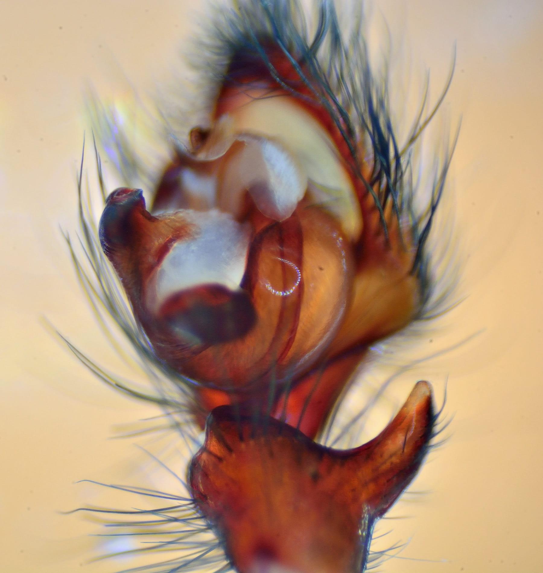 Simon, 1893Macho: prosoma marrón claro con estrías centrales más oscuras, región ocular marrón claro, todos los ojos de tamaño similar; quelíceros marrones con una parte central más clara con cinco dientes anteriores y tres posteriores; gnatocoxas marrón claro-amarillento, labio marrón claro, amarillento distalmente, marrón basalmente; esternón marrón claro con márgenes más oscuros sin patrón. Cara dorsal y ventral del opistosoma gris sin ningún patrón visible. Patas uniformemente marrón claro, con fórmula de las patas: I, II, IV, III. Apófisis tibial retrolateral del palpo extremadamente alargada y ligeramente curvada, apófisis tibial dorsal distalmente proyectada y puntiaguda, triangular, tegulum globular, apófisis media ancha basalmente, estrechándose en la parte central y alargada y distalmente curvada 90 grados, apófisis tegular masiva, más ancha que larga; émbolo con una pequeña apófisis en forma de diente en la parte basal, ensanchada distalmente.